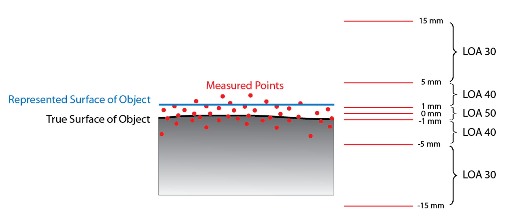 A measured accuracy refers to the accuracy of the actual measurements themselves. In the case of laser scanning, this would be the results achieved in a single scan, or in a set of registered scans. In the illustration provided the red dots represent the measured values returned when the laser strikes the true surface of the object. Due to reflectance, distance, angle of incidence, environmental factors, and the measurement instrument there is always some degree of error, so the measurements don’t always land exactly on the true surface of the object.
