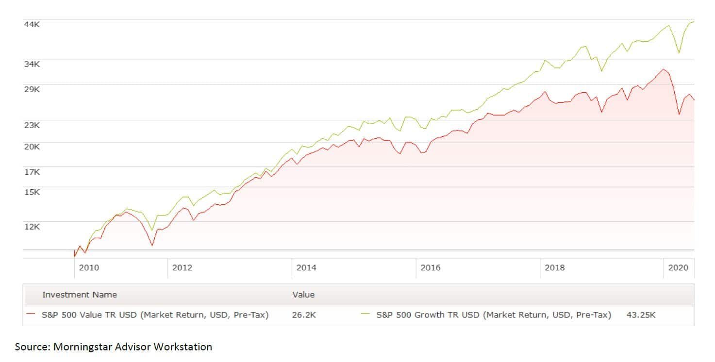 Value of $10,000 Invested in Growth and Value Indexes 10 Years Ago