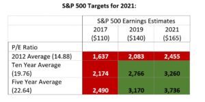 One of the most common ratios used to value the S&P 500 is the price to earnings (P/E) ratio. Most companies have pulled their earnings guidance for the rest of the year. Without guidance on earnings, there is a wide range of possibilities for year-end targets. The slowdown of the global economy will have a significant impact on the S&P 500 earnings for 2020. The price of oil started the year above $50 a barrel and ended the first quarter barely above $20 a barrel. This drop was due to the global slowdown and a price war between Russia and Saudi Arabia. The energy sector made up 5% of S&P 500 earnings in 2019. It is possible that the energy sector posts an earnings loss in 2020. Combining these losses with lower earnings estimates in the industrial sector (11% of earnings) and the materials sector (5% of earnings) and it becomes clear that 2020 earnings will be significantly lower than 2019 earnings. The S&P 500 is at levels not seen since 2017. In 2017, earnings for the S&P 500 were $110 a share. In 2019, earnings were $140 a share. It seems unlikely that 2020 earnings will drop to $110 a share. Before the coronavirus, analysts were estimating $165 a share in 2021 for S&P 500 earnings. More importantly, it seems likely that 2021 earnings could potentially get back to $140 a share.