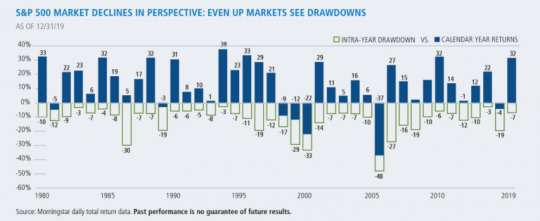 In our year end letter, we cautioned that clients should be emotionally prepared for a decline of close to 20%. Due to a risk that was so unexpected that it wasn’t even considered a possibility the market has dropped over 20% for the year. The decline has been caused by the uncertainty created by the coronavirus. A double-digit decline is not uncommon for the S&P 500, even in years of positive returns (see chart below). When we discuss the risk of stocks, we like to remind clients that the market dropped 22% in one day in 1987 and dropped nearly 50% during the 2001-02 period and the 2008-09 period. Therefore, when people create portfolios, we recommend having exposure to fixed income based on their risk/reward profile. Fixed income provides a source of funds to cover upcoming expenses in these periods of extreme drawdowns. Fixed income also provides funds to add to the stock market during a drawdown.
