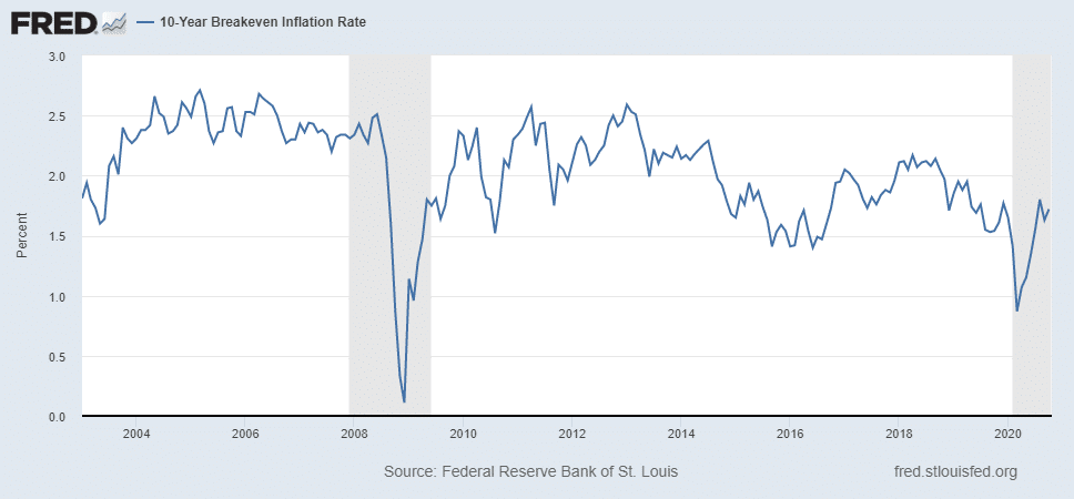TIP’s usually pay lower interest rates than traditional Treasury notes. The difference in the yield to maturity between the TIP and the traditional Treasury note is called the breakeven rate or the implied inflation rate. The breakeven rate, which is currently 1.7% on a ten-year TIP, is the average inflation rate that investors expect over the life of the bond. Since 2003 the breakeven rate has averaged just above 2%. If the actual CPI exceeds the breakeven rate, then the TIP will provide a greater investment return than the traditional Treasury note.